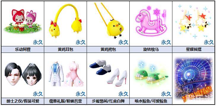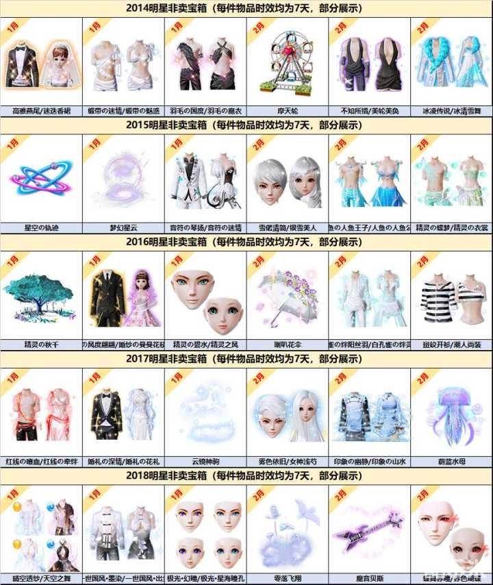 在活动中,小伙伴们将看到春神为大家精心挑选的2014-2018年产出的明星非卖物品,只需使用指定年份的宝箱钥匙即可开启,每次开启消耗3个。100%获得奖池内的明星非卖(7天)之一哦!(注意:因为奖励众多,所以只展示其中的一部分,全部奖励详见游戏)