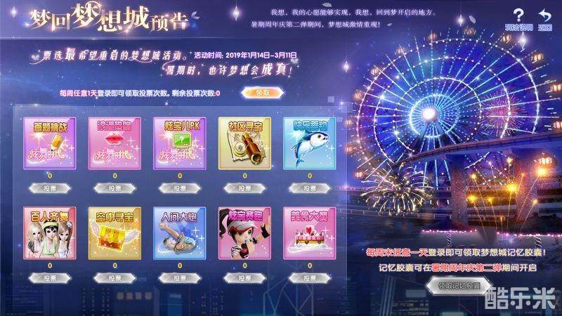 除了投票以外,每周末任意1天登录游戏还能领取到1枚珍贵的“梦想城记忆胶囊”。记忆胶囊可以在周年庆典第二弹期间开启,超萌无敌的座椅、服饰等你来拿!