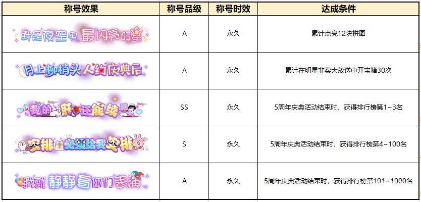 五周年狂欢庆典从1月版本强势开启,在第一弹活动期间将会产出以下称号哦!