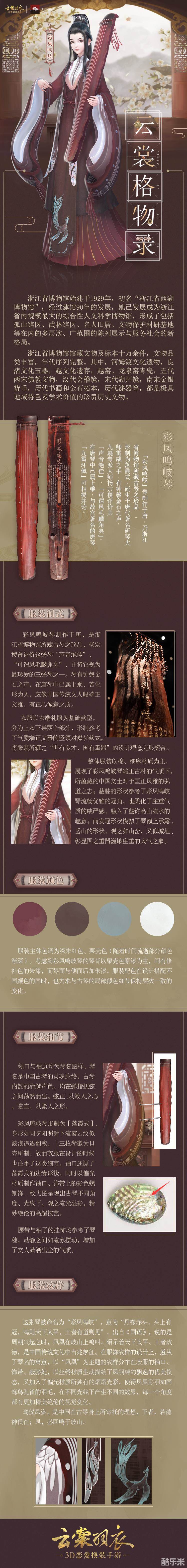 【云裳格物录·彩凤鸣岐】 “落霞琴身存风骨,彩凤七弦鸣盛华。” 《云裳羽衣》与浙江省博物馆联合打造的主题套装【彩凤鸣岐】,服饰设计灵感源自浙博馆藏唐代古琴“彩凤鸣岐”。“彩凤鸣岐”琴制作于唐,是杨宗稷最珍爱的三张琴之一,琴有钟磬金石之声,在唐琴中已属上乘。《云裳羽衣》将“彩凤鸣岐”这一知名唐琴作拟人化演绎,以游戏的形式展现传统文化之美,服装处处体现了设计人员的巧思和对传统文化的热爱。我们希望能将这种热爱和保护文化遗产的正能量传递给游戏中的每一位玩家。