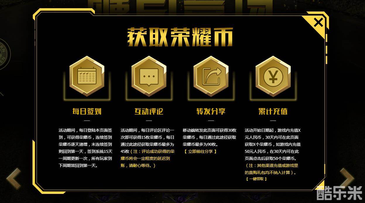 ④活动开始日期起,游戏内充值X元人民币,本期卡王活动时间内可在此页面获取X枚荣耀币,如游戏内充值50元人民币,本期卡王活动时间内可在此页面点击后获取50个荣耀币。(注:其他渠道充值或游戏里的直购礼包均不纳入计算)。