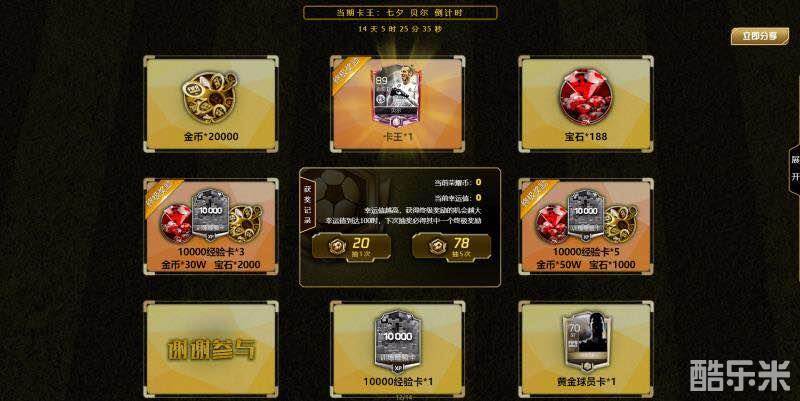 活动期间,抽奖一次消耗20枚荣耀币,抽奖五次消耗78枚荣耀币,大量卡王、金币、宝石、经验卡等你来拿。每抽奖一次,幸运值+1。幸运值≥100,则下次抽奖必得其中一个终极奖励,然后幸运值减100;