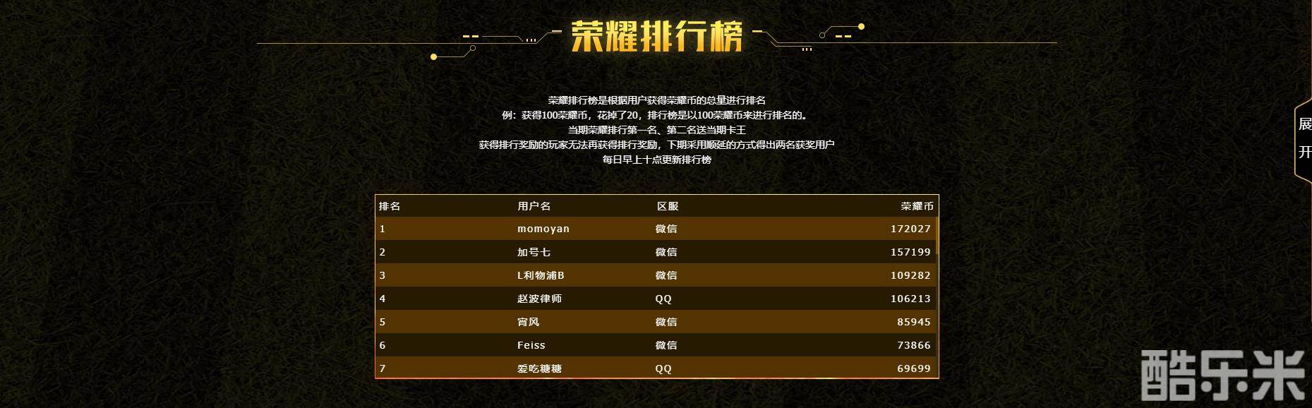 荣耀排行是根据用户活动开始至今获得荣耀币总量量进行排名,当期排名第一名、第二名用户可以直接获得当期卡王的奖励!而到下期则采用顺延的方式得出两位获得荣耀卡王奖励的玩家。