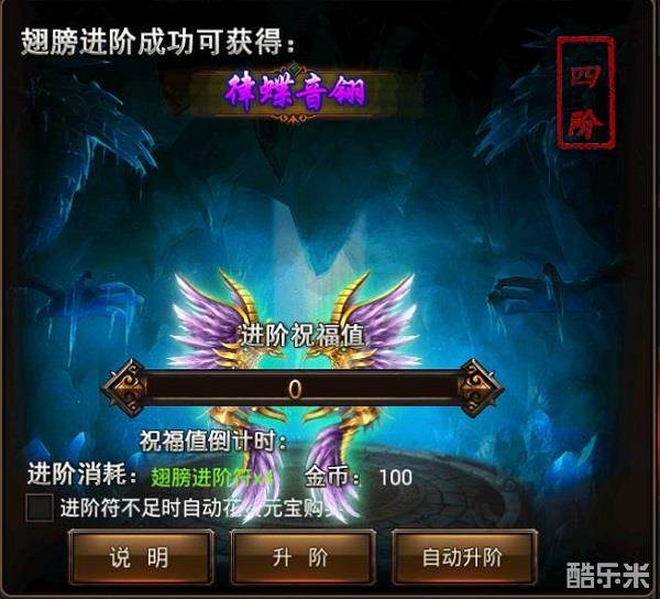 翅膀进阶:进阶需要消耗翅膀进阶符,每次进阶会获得一定的祝福值,当祝福值达到一定数量后,有几率直接进阶到下一等级翅膀,每提升一个阶级,每次进阶所消耗的翅膀进阶符会+1