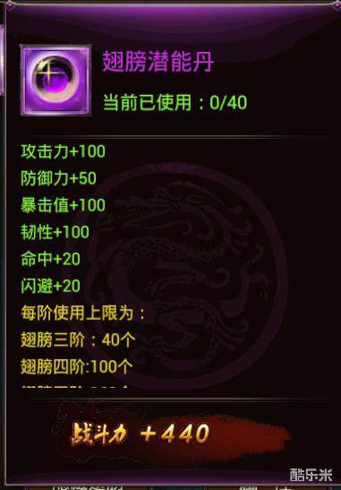 翅膀潜能丹:同时,给翅膀使用“翅膀潜能丹”也会大幅度提升坐翅膀性哦,不同等阶使用的翅膀潜能丹个数不同,等阶越高,使用个数越多,每使用一个将会提升一次属性。