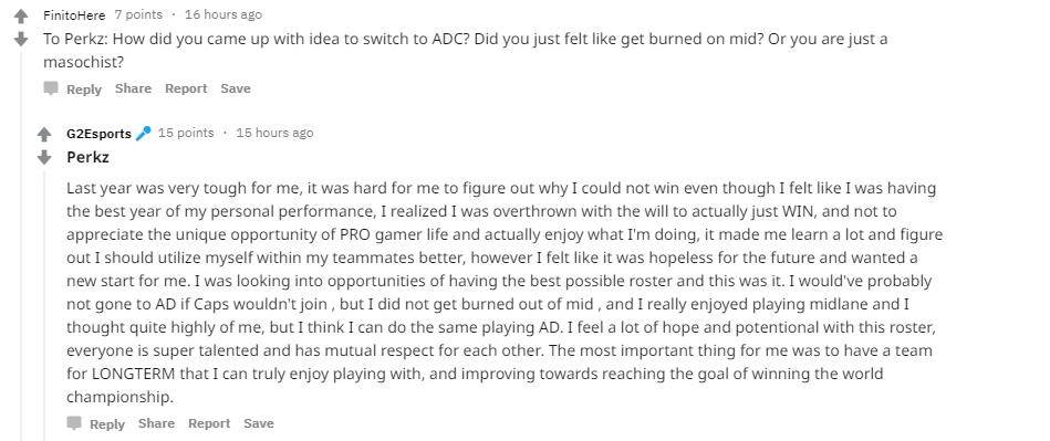 Perkz:我不知道如果不能成功转型我会怎么做。但我对打AD很有信心,因为我的队友们都很支持我。