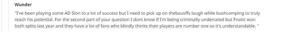 Wunder:我最近全AD输出塞恩玩得也不错,但除非我进草时也能发出TheBausffs式的笑声,我才能达到他的水平。说起第二个问题,我不知道是否我被过分低估了。但是FNC春夏双冠,所以很多粉丝无脑吹FNC的选手也可以理解。