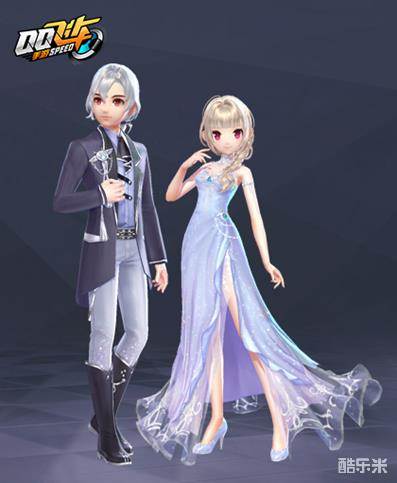 男装为蓝色衬衣搭配深紫色燕尾礼服,黑色领巾突出男生的绅士气质,搭配银色长发更显个性十足。浅色长发搭在一侧,随意却不失精致之感,抹胸长裙衬托女生姣好身材,鱼尾式开叉裙摆层叠交错,妩媚动人。