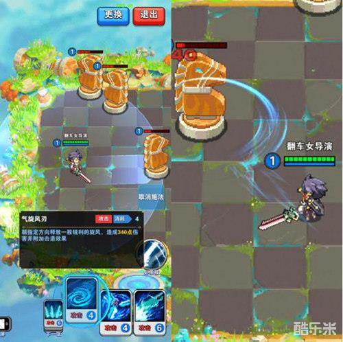 攻击技能2:气旋风刃-超指定方向释放一股锐利的旋风,造成350点伤害并附加击退效果,耗蓝4。
