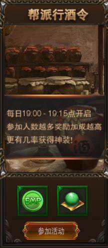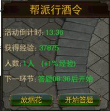 每日19:00—19:15这段时间,帮派行酒令就会开启。参加活动,玩家会进入到帮会地盘,在这里挂机就会不断的有经验值获取。帮会的人数越多,则经验的加成也就越高。