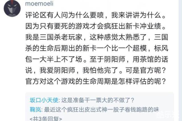 而两个SP式神本应该是一场狂欢,但是却遭到了玩家们的无情炮轰,原因很简单,看着很怕!只有要死的游戏才会疯狂出新的东西来骗氪,什么式神赠送,什么双SP式神的放出,这种感觉对于凉掉的三国杀的老玩家太熟悉了!玩家们也近乎泪目:“我爱阴阳师,我怕他完了,求你别出这么快好吗,给玩家们一点念想和安慰!”