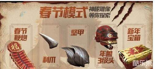 首先终于上线了春节模式,其实这个模式和前不久的圣诞模式差不多。春节模式可以说是中国化的产物,在里面,还有大家期待的“年兽雕像”,然后里面会出来几只年兽,很轻松地打败后就可以获得一些物资,不要太惊喜,里面还有年兽信号枪哦!值得注意的是,“春节模式”只有在海岛图和雪地图才有,其他地图是没有这个的。