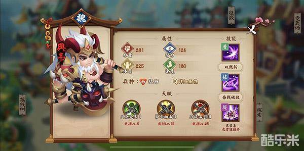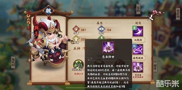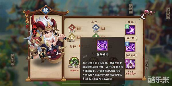 为了庆祝新服【金玉满堂】的开启,不但有一系列壕气的福利活动,更有新武将【典韦】震撼来袭。典韦,是曹操麾下武力最强的战将,以一双巨戟独挡敌军以保主公安危,勇猛无双,被称为“古之恶来”。来到洛阳商业街的他,将延续勇猛无比的输出能力和续战能力,每发动攻击都能挥动2~3次的巨戟,对敌人造成多次巨额伤害;同时,自身血量越低,伤害越高,还有吸血效果。可谓是一名不可多得的狂战猛将,即使在乱军中也能杀出重围,取敌将首级轻松取胜!