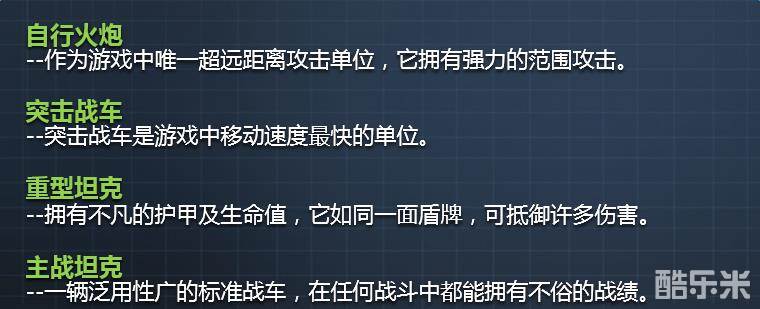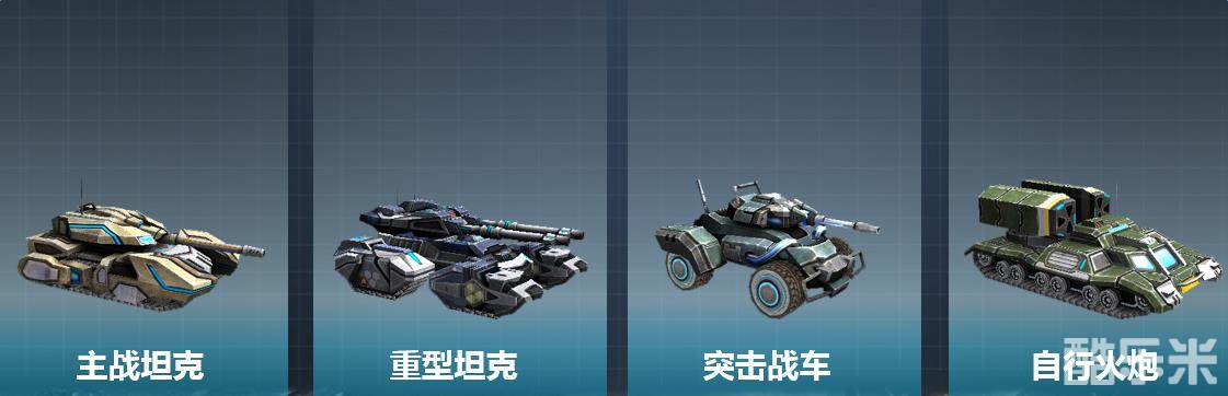 游戏中坦克分为重型坦克、主力型坦克、突击装甲车和自行火炮4种不同类型,在战场上将各司其责,进行协同作战取得最终胜利。