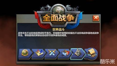 全面战争开启时,参战联盟成员可自由选择敌方据点进行攻击,每个参战的领主都具有两次攻击和防守机会,而且每次攻击前都可以事先进行侦查,来决定是否征战,选择相匹配的对手并尽可能取得高星胜利才能保证联盟最终对决取胜。