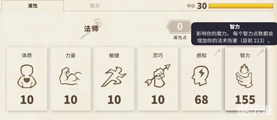 法师的主属性为感知和智力,30级满级后,固定点数为感知68,智力68,其他为10,智力越高输出伤害越高,感知影响魔法蓝条长度,以目前的游戏版本来看,收益最高的还是全智力的加点方法。