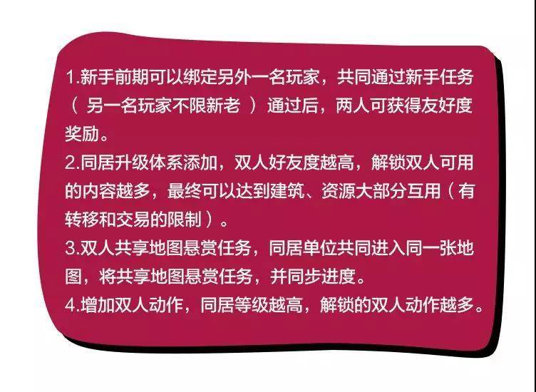 2.同居升级体系添加,双人好友度越高,解锁双人可用的内容越多,最终可以达到建筑、资源大部分互用(有转移和交易的限制)。