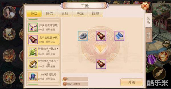 在主菜单【工匠】系统里选择“升级”界面可对角色穿戴的装备进行升级;