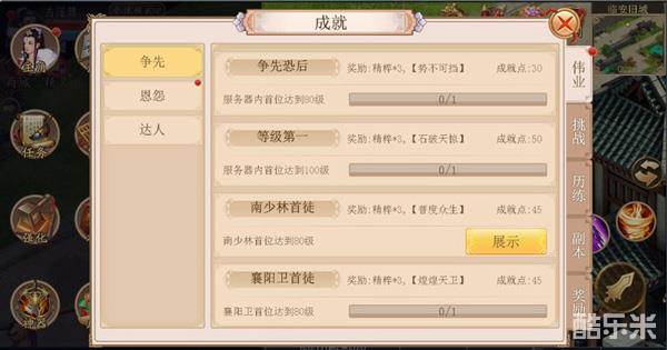 成就分伟业、挑战、副本、成长四个大类,每个类别下又分若干子类成就;