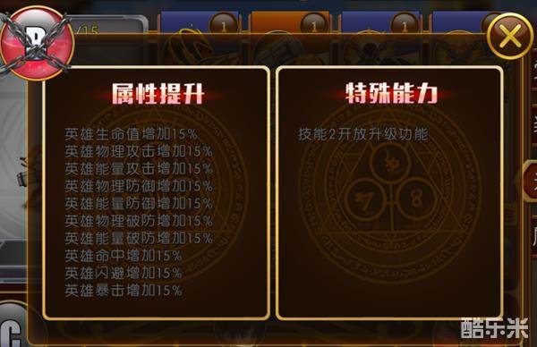 英雄星级提升后,除了基础属性的生命、物理攻击、能量攻击、物理防御、能量防御、物理破防、能量破防、命中、闪避、暴击等提升外,还额外解锁一个新技能,大幅提升英雄实力。每个英雄的前两个技能是英雄的特色主动技能,后两个技能是提升基础属性的被动技能。