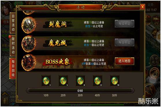 8.魔族入侵:限时多人PVP活动,活动时间,大量BOSS出现在盟重城外,击杀BOSS可掉落大量装备