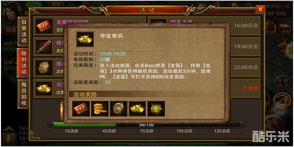 5.夺宝奇兵:限时多人PVP活动,活动中拥有宝箱的玩家可持续获得游戏中道具奖励,活动结束时最后持有宝箱者可获得大量元宝奖励