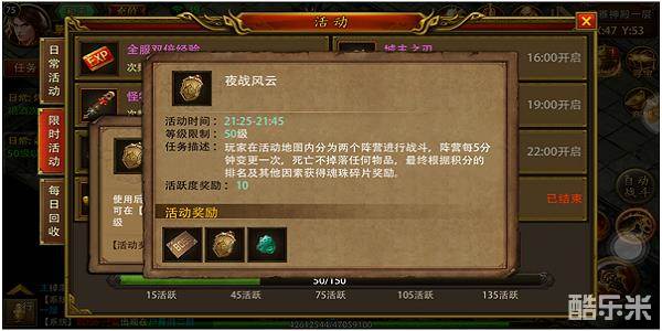 6.夜战风云:限时多人PVP活动,活动时间后进入地图随机分配阵营,击杀玩家或怪物获得对应积分,活动结束后通过右键发放积分奖励,大量魂珠碎片