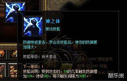 下一等级:1。技能说明:受到攻击时,5%的几率触发防御增加10%,持续5秒,每次触发间隔为30秒。