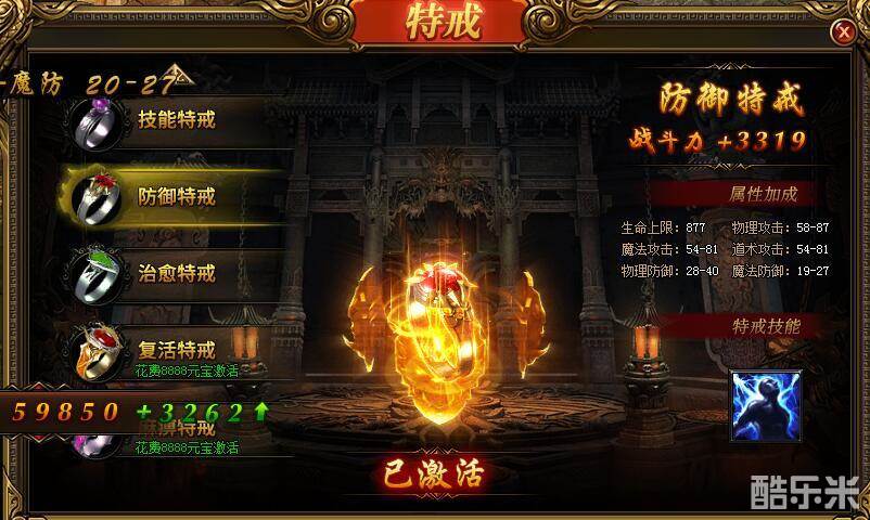 防御特戒,战斗力加成3319,属性加成——生命上限:877,物理攻击:58-87,魔法攻击:54-81,道术攻击:54-81,物理防御:28-40,魔法防御:19-27。