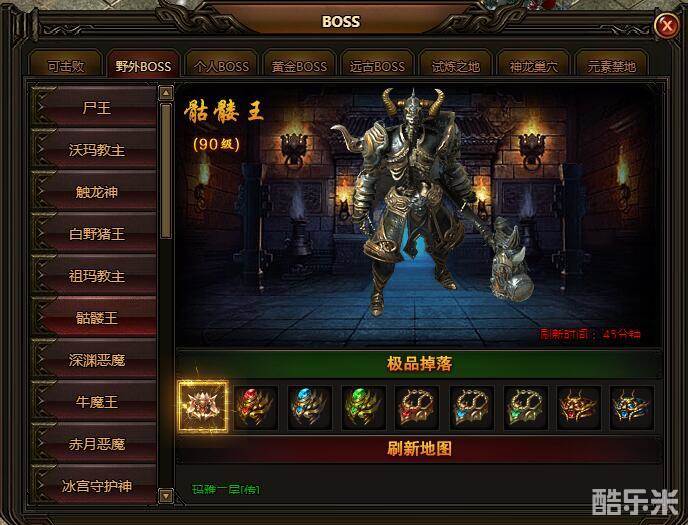在刷新地图方面:骷髅王存在的地图有2个。分别是玛雅二层、帝鸿祭坛一层。两张地图上的BOSS等级属性都相同,没有孰强孰弱之说。