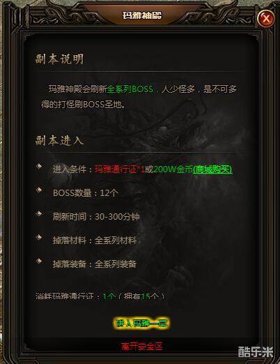 我们先到BOSS的第一个栖息地——就是玛雅一层里面去一探究竟。来到玛雅神殿传送员处,购买一个玛雅通行证或是支付200万金币便能进入。