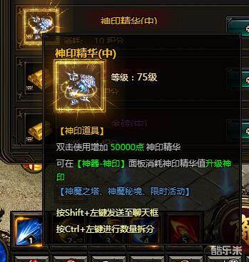神印精华(中)。双击使用增加50000点神印精华。可在【神器-神印】面板消耗神印精华值升级神印。