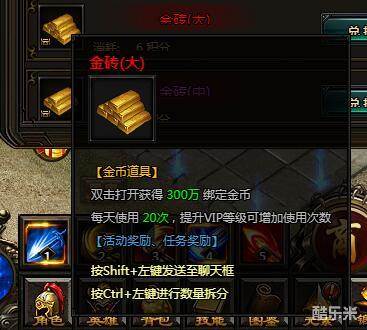 金砖(大)。双击打开获得300万绑定金币。每天使用20次,提升VIP等级可增加使用次数。