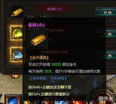 金砖(小)。双击打开获得100万绑定金币。每天使用20次,提升VIP等级可增加使用次数。