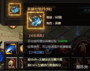 英雄经验丹。双击使用增加英雄经验5000万。经常使用,可以快速提升英雄等级。