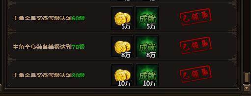 主角全身装备等级达到80级。可获金币10万,成就积分10万。