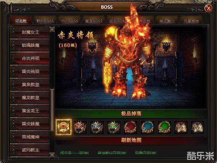 在刷新地图方面:赤炎将领存在的地图有3个。分别是狐月圣山一层、帝鸿祭坛四层和玛雅四层。三张地图上的BOSS等级属性都相同,掉宝也都差不多,没有孰强孰弱之说。