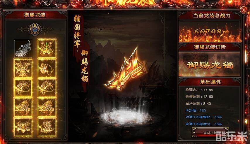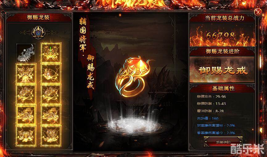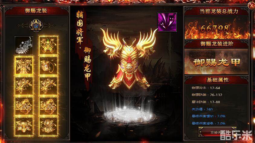 辅国将军·御赐龙甲。物理攻击:12-64,物理防御:26-132,魔法防御:17-88。内功值:240,最终伤害增加:2.0%,最终伤害减免:2.0%。