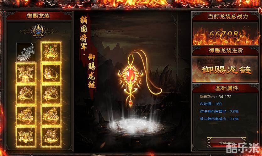 辅国将军·御赐龙链。物理攻击:34-172,内功值:160,对法师伤害增加:2.0%,受法师伤害减少:2.0%。
