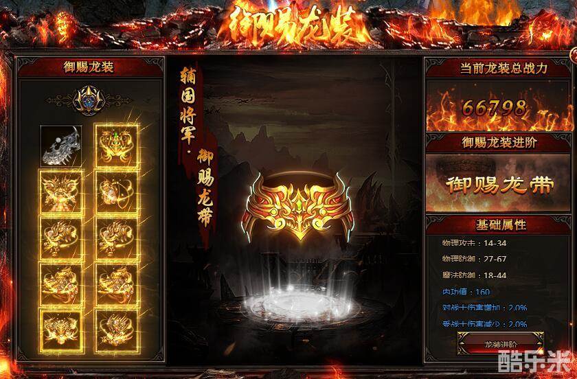 辅国将军·御赐龙带。物理攻击:14-34,物理防御:27-67,魔法防御:18-44。内功值:160,对战士伤害增加:2.0%,受战士伤害减少:2.0%。