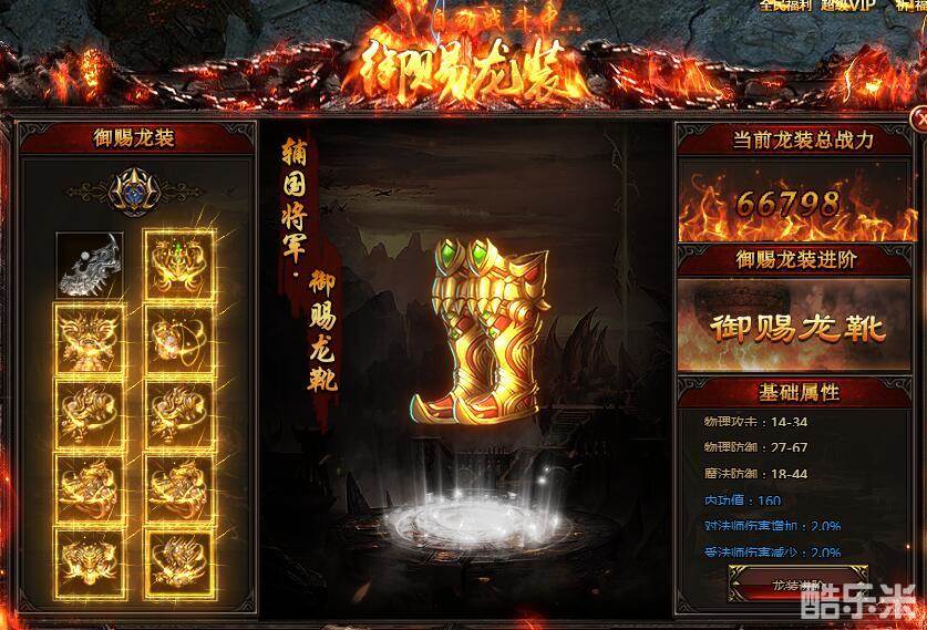 辅国将军·御赐龙靴。物理攻击:14-34,物理防御:27-67,魔法防御:18-44。内功值:160,对法师伤害增加:2.0%,受法师伤害减少:2.0%。