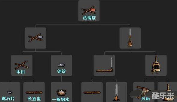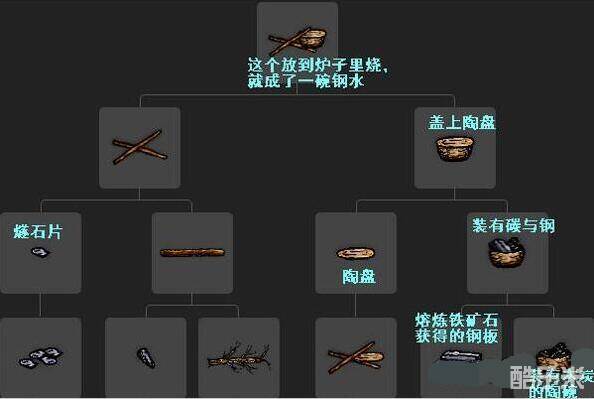 然后放入陶碗中,再放入一些木炭(这时候都用到了)盖上陶盘,用夹子夹住,再次放入熔炉中(接下来都忘了名字),取出,冷却,放在地上,用手拿开陶盘,用夹子夹出钢锭,再次放入熔炉中取出(其实不需要取的,就是对燃烧的熔炉使用它自动变成热钢锭)放在扁石上,用石头敲打变成铁锤头,冷却后装上短木棍(长直树枝被锋利石片使用两次变成短木棍)变成钢锤;