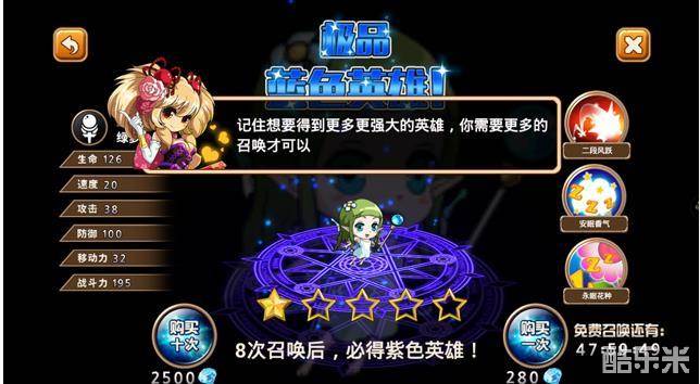 玩家进入游戏后完成初始关卡后就可以获得一次免费召唤英雄,召唤英雄玩家有一定几率获得紫色英雄,紫色英雄在属性和技能上会更加有些一点,这里我们通过系统赠送的免费的召唤英雄获得了一个蓝色英雄,当获得英雄后就可以携带英雄出战,游戏中玩家可以携带3个英雄出战!