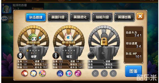 玩家在游戏主界面选择队伍按钮就可以进入队伍管理界面,队伍管理中玩家可以在这里更换自己上阵的英雄,并且玩家还可以在这里给自己的英雄进行升级、英雄进化、英雄技能提升等功能。玩家可以点击面板上的鉴功能查看各种属性分类的所有英雄。