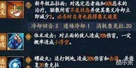 奥义:对选定忍者施加50%忍术的治疗,驱散所有不良状态并施加奥义冷却立即减少2。必杀时自身也获得奥义效果