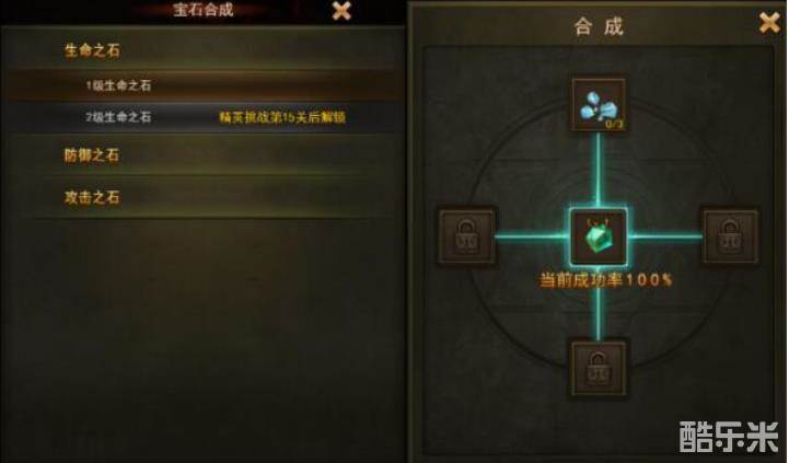 2、宝石合成:宝石分成生命、防御和攻击,合成概率是100%成功。但是宝石的开启以及高等级宝石的合成与精英挑战的通关层数有关。