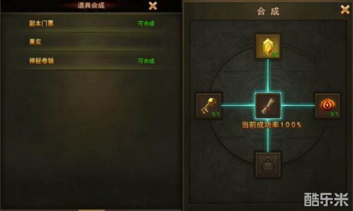 3、道具合成:主要是常用的副本门票以及神秘商店卷轴等的合成,合成概率也是100%。