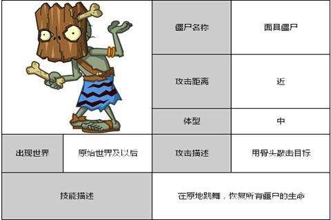 植物大战僵尸全明星面具僵尸的外貌似乎是在石器时代,带着木头制作的护罩,手里拿着骨头,原来骨头就是武器,穿着那个时代的衣服,其实是一位巫医哦,是由巫医死去后变成的,但是依然不会减退对治病的热爱。