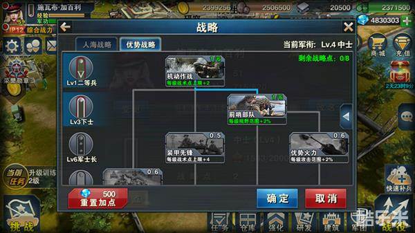 伴随着每次军衔升级,玩家会获得2点战略点数,可以使用战略点来增加战略技能,增强指挥官能力,目前游戏中的战略技能主要有以下几种: