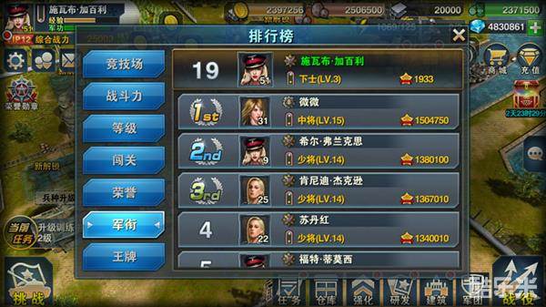军衔:根据玩家目前军衔进行排行,军衔越高,排行越靠前。